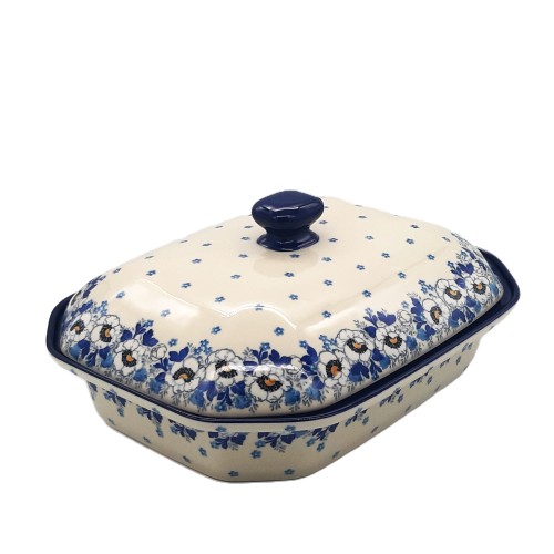 3. Estetyka: Charakterystyczne dla ceramiki Bolesławiec wzory i kolorystyka nadają brytfannom z pokrywą niepowtarzalnego uroku i stylu. Mogą być one ozdobione różnorodnymi motywami, takimi jak kwiaty, krople czy geometryczne wzory, co dodaje im wyjątkowego charakteru i sprawia, że są one również atrakcyjnym elementem dekoracyjnym kuchni.