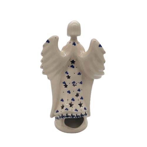 Anioł lampion z ceramiki Bolesławiec o wysokości 23 cm to urocza ozdoba wykonana w tradycyjnym stylu charakterystycznym dla tej manufaktury. Postać anioła została starannie uformowana, z wyrazistymi detalami. Jego powierzchnia pokryta jest wzorami bolesławieckimi w odcieniach bieli, kobaltu i błękitu, choć możliwe są różne wariacje kolorystyczne. W środku lampionu znajduje się przestrzeń na świeczkę, której światło tworzy ciepły, przyjemny efekt, rozświetlając otwory w kształcie gwiazdek na ciele anioła. Ten ręcznie zdobiony lampion stanowi nie tylko źródło światła, ale też piękną dekorację, idealną na świąteczny stół lub komodę.