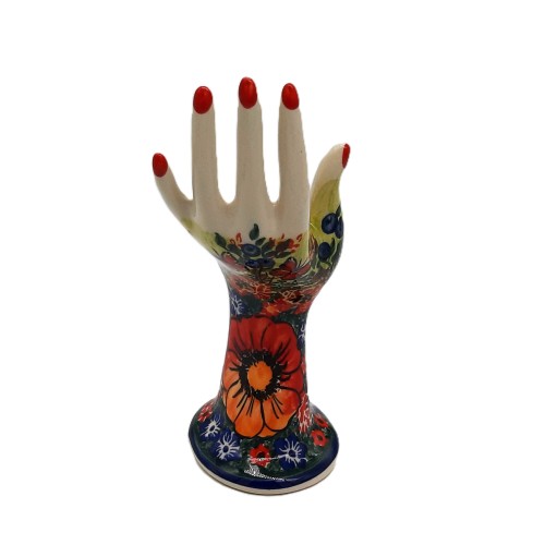 Kształtem przypomina smukłą rączkę, z wyciągniętymi palcami przeznaczonym do przechowywania pierścionków. Solidne wykonanie i trwała ceramika sprawiają, że produkt jest nie tylko estetyczny, ale także wytrzymały. Taki stojak to idealny dodatek do toaletki lub prezent dla miłośnika rękodzieła i polskiej tradycji ceramicznej.