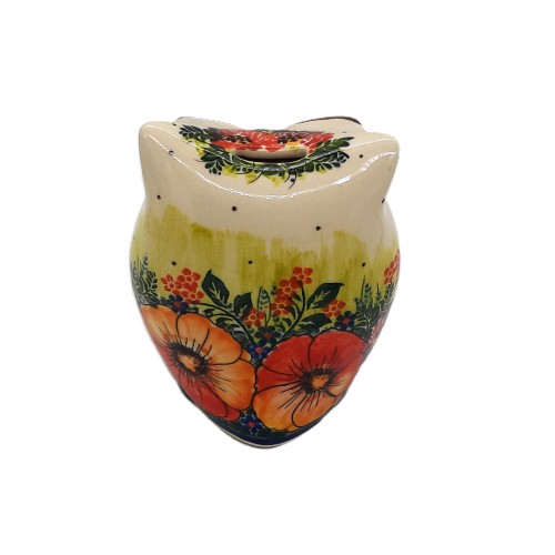 Skarbonka w kształcie sowy, wykonana z tradycyjnej ceramiki bolesławieckiej, charakteryzuje się wysokością 13,5 cm. Jest zdobiona ręcznie malowanymi motywami kwiatowymi, w tym kolorowymi makami, stokrotkami i innymi detalami roślinnymi, typowymi dla stylu bolesławieckiego. Dominują kolory czerwieni, granatu, bieli i zieleni na kremowym tle. Przedmiot łączy funkcjonalność z estetyką, będąc zarówno praktyczną skarbonką, jak i dekoracją o unikatowym, tradycyjnym uroku.
