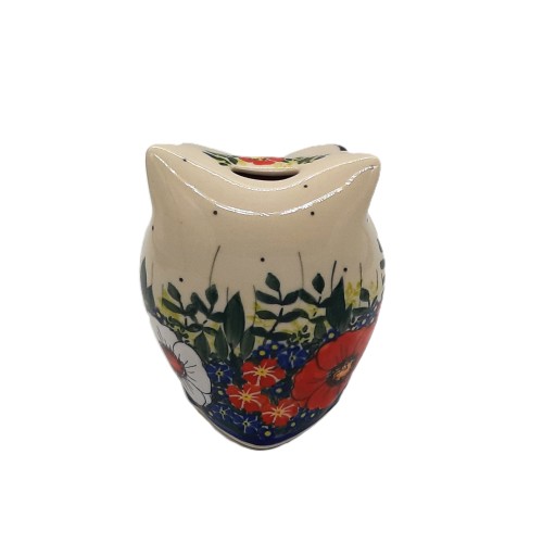 Skarbonka w kształcie sowy, wykonana z tradycyjnej ceramiki bolesławieckiej, charakteryzuje się wysokością 13,5 cm. Jest zdobiona ręcznie malowanymi motywami kwiatowymi, w tym kolorowymi makami, stokrotkami i innymi detalami roślinnymi, typowymi dla stylu bolesławieckiego. Dominują kolory czerwieni, granatu, bieli i zieleni na kremowym tle. Przedmiot łączy funkcjonalność z estetyką, będąc zarówno praktyczną skarbonką, jak i dekoracją o unikatowym, tradycyjnym uroku.