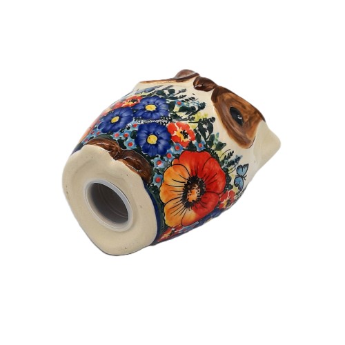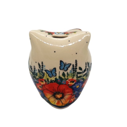 Skarbonka w kształcie sowy, wykonana z tradycyjnej ceramiki bolesławieckiej, charakteryzuje się wysokością 13,5 cm. Jest zdobiona ręcznie malowanymi motywami kwiatowymi, w tym kolorowymi makami, stokrotkami i innymi detalami roślinnymi, typowymi dla stylu bolesławieckiego. Dominują kolory czerwieni, granatu, bieli i zieleni na kremowym tle. Przedmiot łączy funkcjonalność z estetyką, będąc zarówno praktyczną skarbonką, jak i dekoracją o unikatowym, tradycyjnym uroku.