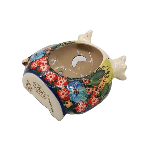 Ręcznie wykonana lampka – sowa z Bolesławca marki Cer-Raf. Ceramiczny lampion na tealight, zdobiony kwiatowym motywem, unikatowy i sygnowany przez twórcę. Wysokość 11,5 cm, szerokość 10,5 cm. Hand made, idealny jako dekoracja lub oryginalny prezent.