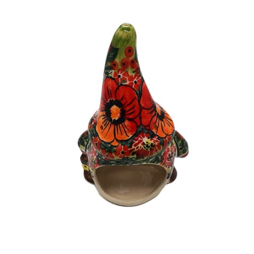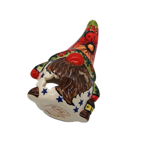 Ręcznie malowana ceramiczna lampka w kształcie krasnala, sygnowana przez twórcę. Przeznaczona na tealight, tworzy nastrojowe światło dzięki dekoracyjnym wycięciom. Produkt unikatowy, wykonany w słynnej bolesławieckiej manufakturze. Można myć w zmywarce.