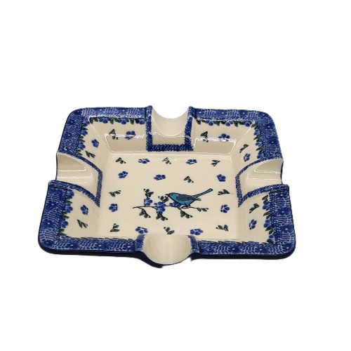 Elegancka ceramiczna popielnica wykonana ręcznie przez Spółdzielnię Rękodzieła Artystycznego w Bolesławcu. Ozdobiona bolesławieckim wzorem w odcieniach zieleni, granatu i bieli. Idealnie łączy funkcjonalność z artystycznym charakterem, dzięki czemu sprawdzi się zarówno w domu, jak i w ogrodzie czy na tarasie.