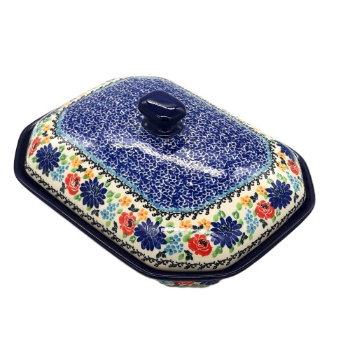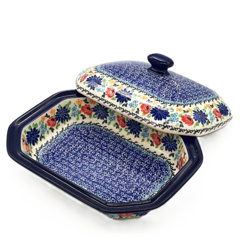 Brytfanna z pokrywką do pieczenia z ceramiki bolesławieckiej z motywem kwiatowym to piękne i praktyczne naczynie do pieczenia, duszenia i zapiekania potraw. Jest ręcznie malowana tradycyjnymi wzorami bolesławieckimi i wykonana z wysokiej jakości gliny. Brytfanna jest bezpieczna w piekarniku, kuchence mikrofalowej i zmywarce.