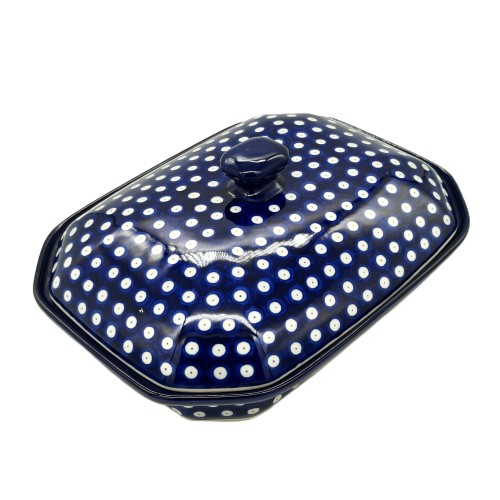 Brytfanna z pokrywą z ceramiki Bolesławiec z motywem pawie oczka to eleganckie i praktyczne naczynie, idealne do pieczenia i serwowania różnorodnych potraw. Ręcznie zdobiona w motyw geometryczny w odcieniach niebieskiego nadaje brytfannie unikalny, rustykalny charakter. Wykonana z trwałej kamionki, brytfanna jest odporna na wysokie temperatury, co czyni ją idealną do używania w piekarniku. Pokrywa pozwala na równomierne pieczenie i zachowanie wilgotności potraw. Naczynie jest nie tylko funkcjonalne, ale również pięknie prezentuje się na stole.