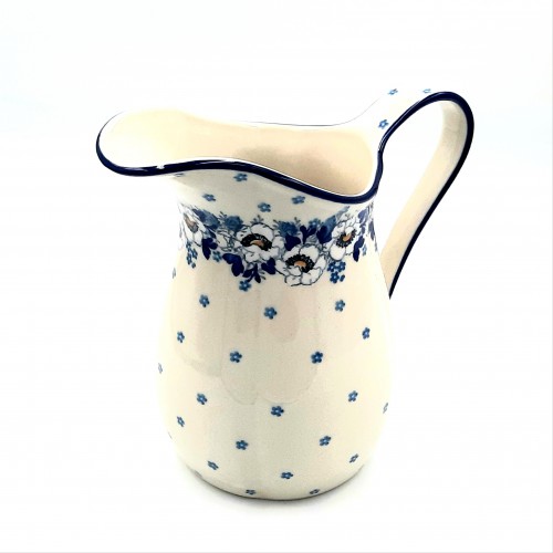 Piękny dzbanek na kompot, wodę,sok o pojemności 1,2 litra, wykonany z ceramiki bolesławieckiej- kamionki. Dekorowany jest w odcieniach niebieskiego. Na powierzchni dzbanka dominują subtelne motywy kwiatowe, które nadają mu delikatny, naturalny wygląd. Górna krawędź ozdobiona jest ciemniejszym, niebieskim ornamentem, który tworzy elegancki kontrast z jasnym tłem naczynia.