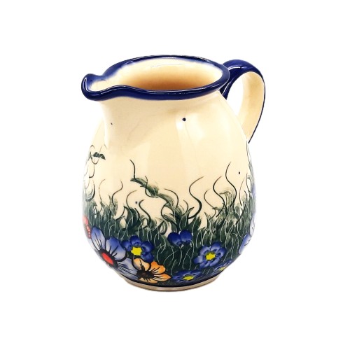 Dzbanek o pojemności 1,2 litra z motywem kwiatowym oraz trawką wykonany z ceramiki Bolesławiec to klasyczny przykład polskiej sztuki rzemieślniczej. Ceramika z Bolesławca, znana na całym świecie z wyjątkowego rękodzieła, charakteryzuje się wysoką jakością i tradycyjnym sposobem wytwarzania. Dzbanek ozdobiony jest subtelnym wzorem roślinnym , które dodają mu uroku i naturalnego charakteru. Ręcznie malowane detale w typowych w odcieniach niebieskiego, zieleni i harmonizują z tłem ceramiki. Naczynie jest nie tylko piękną ozdobą stołu, ale również praktycznym elementem kuchennym, idealnym do serwowania napojów.