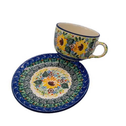 Na zewnętrznej powierzchni filiżanki znajduje się wyjątkowy motyw słoneczników w odcieniach żółci i zieleni. Każdy szczegół został starannie wyrzeźbiony przez utalentowanych rzemieślników z Bolesławca, co nadaje filiżance niepowtarzalny urok.