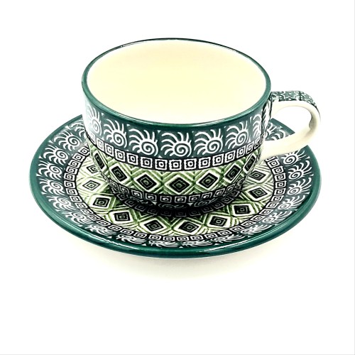 Na zewnętrznej powierzchni filiżanki znajduje się wyjątkowy motyw geometryczny w odcieniach zielonego. Każdy szczegół został starannie wyrzeźbiony przez utalentowanych rzemieślników z Bolesławca, co nadaje filiżance niepowtarzalny urok.
