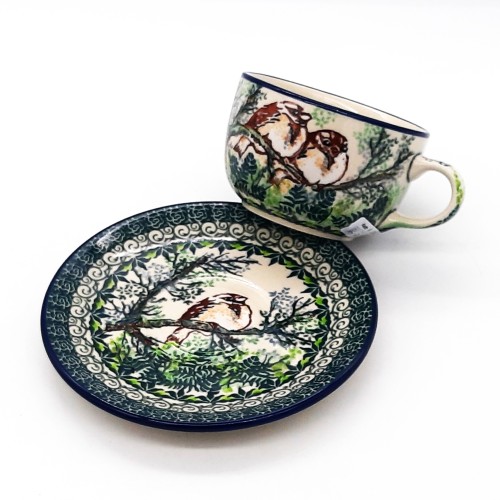 Filiżanka do kawy/herbaty z ceramiki bolesławieckiej z motywem leśnym z elementem ptaszków to piękny i wyjątkowy przedmiot, idealny do picia kawy, herbaty lub innych napojów.  Filiżanka jest wykonana z wysokiej jakości ceramiki i jest bezpieczna w zmywarce i kuchence mikrofalowej.