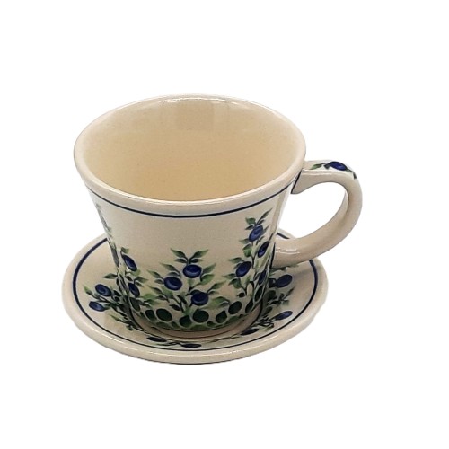 Filiżanka do kawy/herbaty z ceramiki bolesławieckiej to piękny i wyjątkowy przedmiot, idealny do picia kawy, herbaty lub innych napojów. Jest ręcznie malowana  z motywem borówek i wykonana z wysokiej jakości ceramiki.  Ponadto jest bezpieczna w zmywarce i kuchence mikrofalowej.