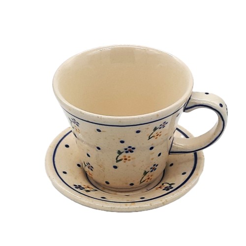 Filiżanka do kawy/herbaty z ceramiki bolesławieckiej to piękny i wyjątkowy przedmiot, idealny do picia kawy, herbaty lub innych napojów. Jest ręcznie malowana  z motywem drobnych kwiatuszków i wykonana z wysokiej jakości ceramiki.  Ponadto jest bezpieczna w zmywarce i kuchence mikrofalowej.