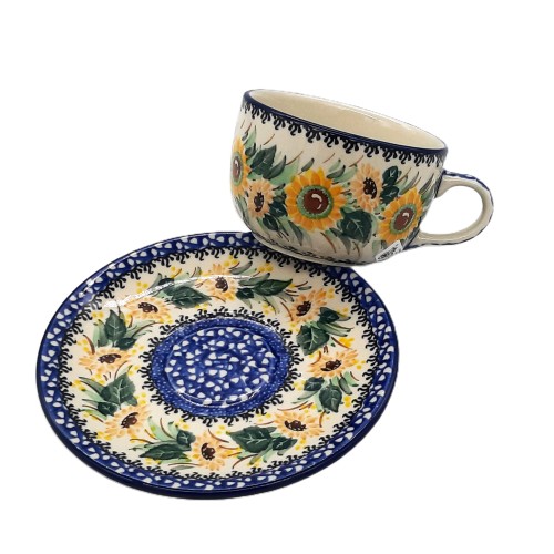 Na zewnętrznej powierzchni filiżanki znajduje się wyjątkowy motyw ze słonecznikami. Każdy szczegół został starannie wyrzeźbiony przez utalentowanych rzemieślników z Bolesławca, co nadaje filiżance niepowtarzalny urok.