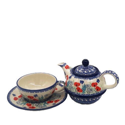 Zestaw dekorowany jest motywem z makami w kolorystyce w odcieniach niebieskiego, czerwieni i zielonego. Wzory nadają zestawowi eleganckiego i wytwornego charakteru. Ceramika bolesławiecka słynie z wysokiej jakości i trwałości, dlatego zestaw ten będzie służyć przez wiele lat.