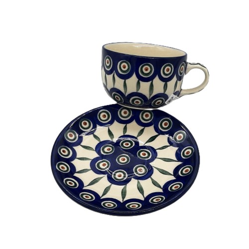 Na zewnętrznej powierzchni filiżanki znajduje się wyjątkowy motyw pawich oczek oraz listków. Każdy szczegół został starannie wyrzeźbiony przez utalentowanych rzemieślników z Bolesławca, co nadaje filiżance niepowtarzalny urok.