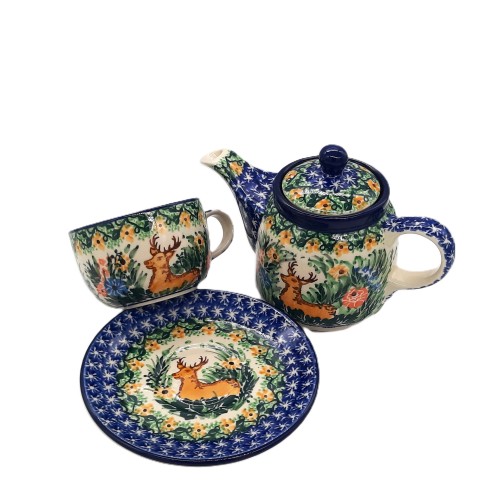 Zestaw dekorowany jest motywem roślinnym z elementem jelenia w kolorystyce wielobarwnej. Delikatne wzory nadają zestawowi eleganckiego i wytwornego charakteru. Ceramika bolesławiecka słynie z wysokiej jakości i trwałości, dlatego zestaw ten będzie służyć przez wiele lat.
