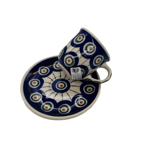 Piękna filiżanka do espresso z ceramiki bolesławieckiej, ręcznie malowana z motywem pawich oczek. Idealna do porannej kawy i popołudniowego espresso.
