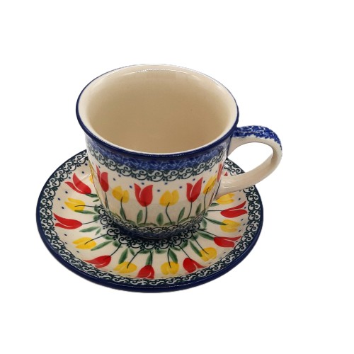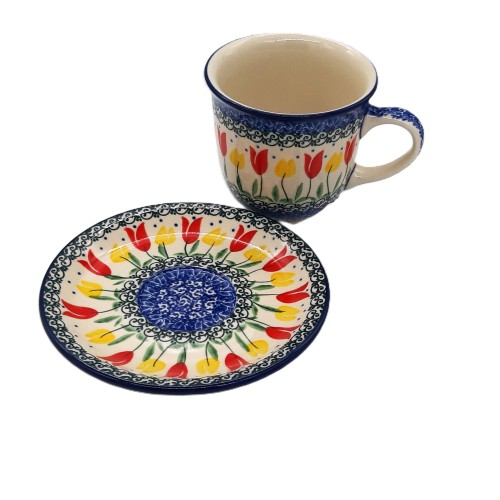 Filiżanka do kawy/herbaty z ceramiki bolesławieckiej z motywem tulipanów to piękny i wyjątkowy przedmiot, idealny do picia kawy, herbaty lub innych napojów. Jest ręcznie malowana   i wykonana z wysokiej jakości ceramiki.  Ponadto jest bezpieczna w zmywarce i kuchence mikrofalowej.