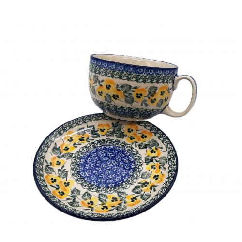 Filiżanka do kawy/herbaty z ceramiki bolesławieckiej z motywem bratków to piękny i wyjątkowy przedmiot, idealny do picia kawy, herbaty lub innych napojów. Jest ręcznie malowana   i wykonana z wysokiej jakości ceramiki.  Ponadto jest bezpieczna w zmywarce i kuchence mikrofalowej.