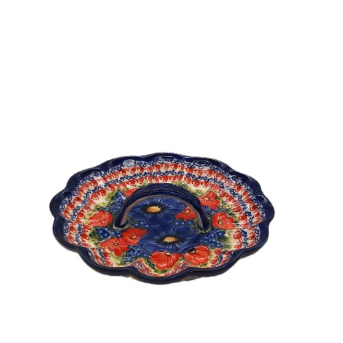 Elegancka patera ceramiczna z uchwytem, wykonana z wysokiej jakości ceramiki bolesławieckiej, zachwyca ręcznie malowanym, kwiatowym wzorem inspirowanym naturą. Starannie zdobiona powierzchnia oraz charakterystyczne, głębokie kolory sprawiają, że produkt doskonale łączy funkcjonalność z wyjątkową estetyką. Idealna do serwowania ciast, owoców lub przekąsek, a także jako efektowna dekoracja stołu i wnętrza. Każdy egzemplarz jest unikatowy, co podkreśla jego rzemieślniczy charakter i autentyczność.