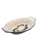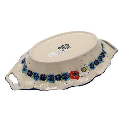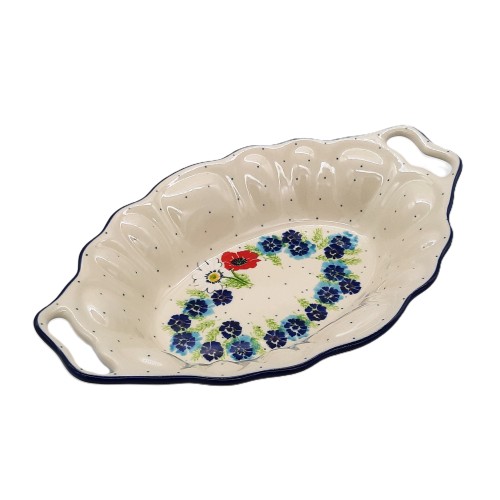 Elegancka, ręcznie zdobiona patera ceramiczna o wysokości 7 cm i wymiarach 34,5 × 22,5 cm wykonana przez Spółdzielnię Rękodzieła Artystycznego w Bolesławcu. Naczynie zachwyca bolesławieckim wzornictwem – motywem kwiatowym w odcieniach niebieskiego,czerwieni i zieleni na jasnym tle. Fakturowany rant i wygodne uchwyty dodają jej funkcjonalności i uroku.