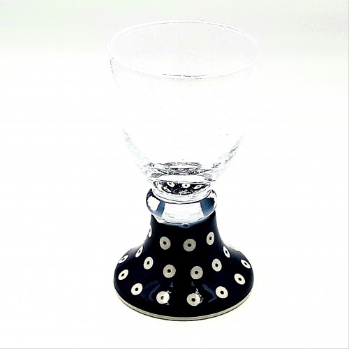 Szklanka do napojów o pojemności 0,3 l i wysokości 16,7 cm. Górna część wykonana jest ze szkła nakrapianego, natomiast podstawa wykonana jest z ceramiki bolesławiec, charakteryzującej się kobaltowym tłem w białe groszki. Podstawa ceramiczna dodaje tradycyjnego i artystycznego akcentu do szkła, typowego dla dobrze znanej ceramiki Bolesławiec, która często ma ręcznie malowane wzory w odcieniach kobaltu. Ta kombinacja szkła i ceramiki tworzy atrakcyjny i funkcjonalny element, który łączy nowoczesny i tradycyjny styl.