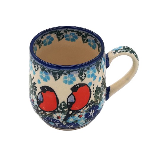 - Dekoracja: Kubek zdobiony jest motywem roślinnym z gilami, ręcznie malowanym w żywych, nasyconych kolorach. Dominują odcienie zieleni, czerwieni,niebieskiego co nadaje kubkowi świeży i wiosenny charakter.
