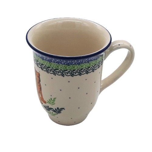 Duży kubek V: 0,45 l z kamionki z motywem tygryska z ceramiki Bolesławiec to prawdziwy klejnot dla miłośników kotów i ręcznie wykonanych produktów ceramicznych.