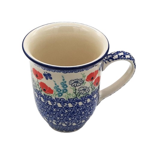 Na zewnętrznej powierzchni kubka znajdziesz uroczy wzór z makami w odcieniach czerwieni i niebieskiego. Każdy detal jest starannie wykonany, nadając kubkowi niepowtarzalny urok.