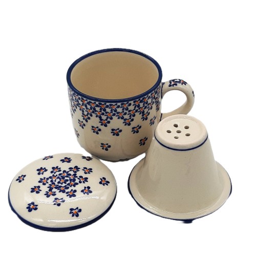 Praktyczny i elegancki kubek z sitkiem ceramicznym z pokrywką na zioła o pojemności 0,27 l i wysokości 10,5 cm z ceramiki bolesławieckiej.
