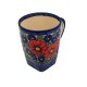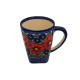 Ręcznie wykonany i malowany kubek z fabryki CER-RAF Bolesławiec, charakteryzujący się unikatowym wzorem w żywych kolorach. Dekoracja przedstawia piękne, czerwone i granatowe kwiaty na tle klasycznej, kobaltowej obwódki.