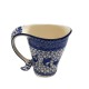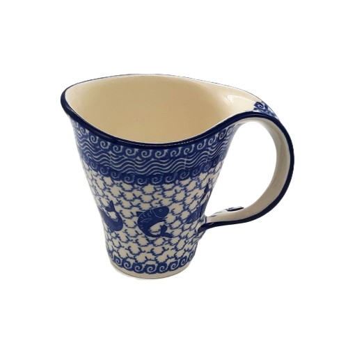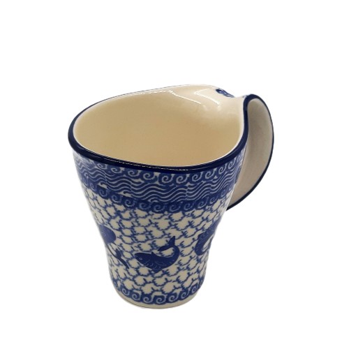 Elegancki kubek w kształcie ryby, ręcznie wykonany i malowany w tradycyjnym stylu bolesławieckiej ceramiki. Utrzymany w kolorystyce — błękity, granaty tworzą harmonijny wzór z motywem rybek . Każdy egzemplarz jest unikatowy, powstały z dbałością o każdy detal przez polskich rzemieślników.