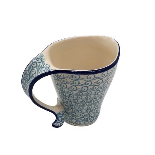 Elegancki kubek w kształcie ryby, ręcznie wykonany i malowany w tradycyjnym stylu bolesławieckiej ceramiki. Utrzymany w kolorystyce — błękity, tworzą harmonijny wzór z motywem kolorowych rybek . Każdy egzemplarz jest unikatowy, powstały z dbałością o każdy detal przez polskich rzemieślników.