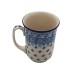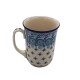 Kubek wykonany ręcznie z tradycyjnej ceramiki Bolesławiec i ozdobiony jest uroczym motywem gwiazdek na jasnym tle. Jest solidny i trwały, idealny do codziennego użytku.