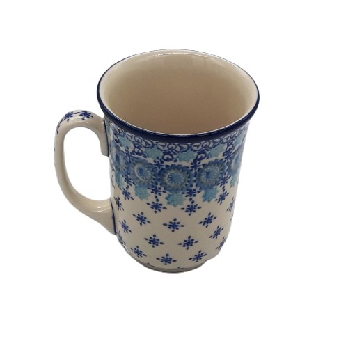 Duży kubek z ceramiki bolesławieckiej jest ozdobiony niebieskimi gwiazdkami na jasnym tle i ma pojemność 0,45 litra .Został ręcznie wykonany przez wykwalifikowanych rzemieślników z Bolesławca. Jego piękny wzór sprawia, że jest świetnym dodatkiem do porannej rutyny.