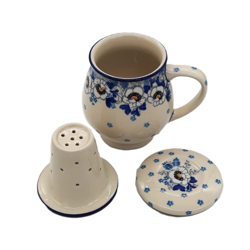 Praktyczny i elegancki kubek z sitkiem ceramicznym z pokrywką na zioła o pojemności 0,4 l i wysokości 11 cm z ceramiki bolesławieckiej.
