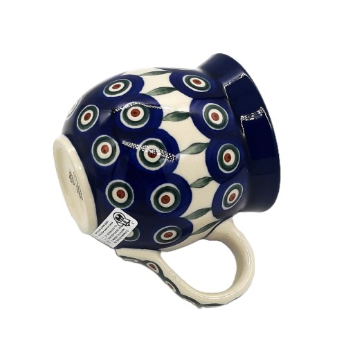 Kubek czeski o pojemności 0,35 l z motywem pawich oczek oraz listków, wykonany z ceramiki bolesławieckiej, to elegancki i funkcjonalny przedmiot codziennego użytku. Charakteryzuje się następującymi cechami: