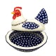 Ręcznie malowana misa z przykrywką w kształcie kury – wyjątkowy wyrób ceramiczny ze Spółdzielni Rękodzieła Artystycznego w Bolesławcu. Naczynie wykonane z wysokiej jakości ceramiki, zdobione tradycyjną metodą stempelkową w charakterystyczne niebiesko-białe wzory. Praktyczne i dekoracyjne – idealne do serwowania potraw, przechowywania jajek, słodyczy czy drobiazgów kuchennych.