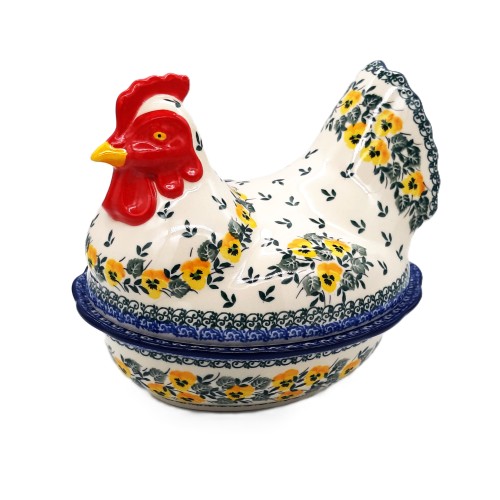 Ten ceramiczny pojemnik ma wymiary 24 cm na 20 cm i wysokość 22 cm. Jest to produkt o charakterystycznym dla ceramiki bolesławieckiej stylu, z ręcznie malowanymi wzorami w odcieniach żółtego  z motywem bratków. Kura, będąca głównym elementem tego pojemnika, ma zarysowane detale, takie jak grzebień i dziób  co dodaje jej uroku.