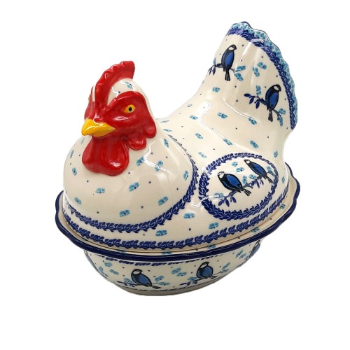 Ręcznie malowana misa z przykrywką w kształcie kury – wyjątkowy wyrób ceramiczny ze Spółdzielni Rękodzieła Artystycznego w Bolesławcu. Naczynie wykonane z wysokiej jakości ceramiki, zdobione w niebiesko-białe ptaszki. Praktyczne i dekoracyjne – idealne do serwowania potraw, przechowywania jajek, słodyczy czy drobiazgów kuchennych.