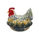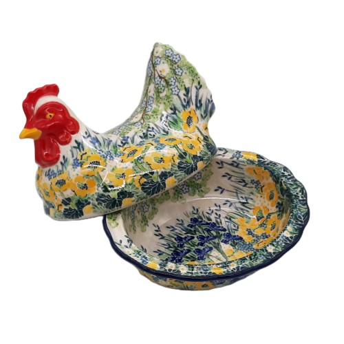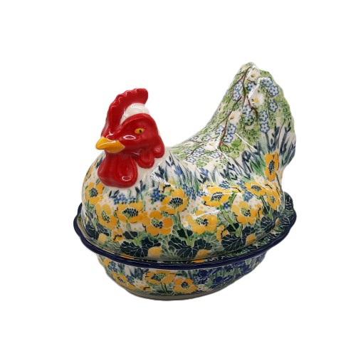 Ten ceramiczny pojemnik ma wymiary 24 cm na 20 cm i wysokość 22 cm. Jest to produkt o charakterystycznym dla ceramiki bolesławieckiej stylu, z ręcznie malowanymi wzorami w odcieniach wielobarwnych z motywem niezapominajek, irysów istokrotek. Kura, będąca głównym elementem tego pojemnika, ma zarysowane detale, takie jak grzebień i dziób  co dodaje jej uroku.