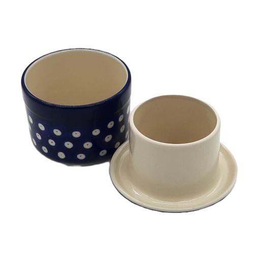 • Wzór: Maselnica zdobiona jest motywem w pawie oczka w odcieniach kobaltu. Ten ręcznie malowany wzór jest charakterystyczny dla ceramiki bolesławieckiej i sprawia, że każda maselnica jest unikalna.
