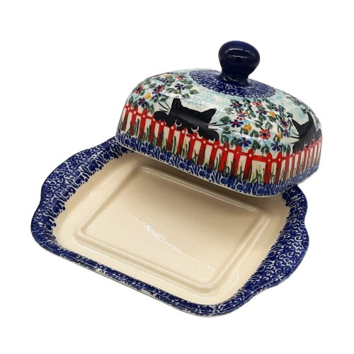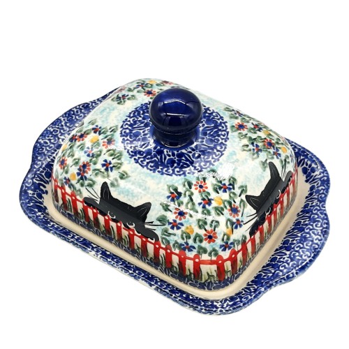 Maselnica z ceramiki bolesławieckiej o wymiarach 15 x 21 cm to stylowy i funkcjonalny element zastawy stołowej, wykonany z wyjątkową dbałością o detale. Pokrywka i podstawka maselnicy ozdobione są ręcznie malowanymi motywami z kotkami, charakterystycznymi dla ceramiki z Bolesławca –  w odcieniach wielobarwnych, co nadaje jej ciepły, folkowy charakter. Szkliwiona powierzchnia zapewnia maselnicy trwałość i odporność na działanie tłuszczu, dzięki czemu masło długo zachowuje świeżość. Ten elegancki element zastawy pięknie prezentuje się na stole, doskonale pasując do innych naczyń w stylu bolesławieckim, a jednocześnie wnosi do wnętrza akcent tradycyjnego, polskiego rzemiosła.