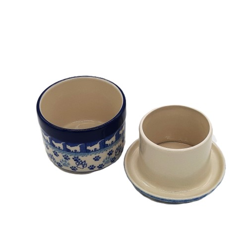 • Wzór: Maselnica zdobiona jest motywem w kocie łapki oraz elementem czarnego kota, który nadaje jej lekkości i elegancji. Ten ręcznie malowany wzór jest charakterystyczny dla ceramiki bolesławieckiej i sprawia, że każda maselnica jest unikalna.