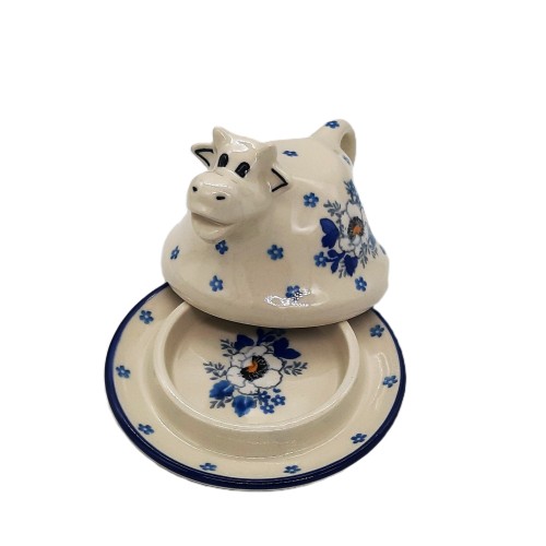 Urocza maselnica w kształcie krówki to wyjątkowe połączenie funkcjonalności i tradycyjnego bolesławieckiego wzornictwa. Ręcznie formowana i zdobiona charakterystycznym, kwiatowym motywem w odcieniach kobaltu, stanowi nie tylko praktyczny element wyposażenia kuchni, ale również piękną dekorację stołu.