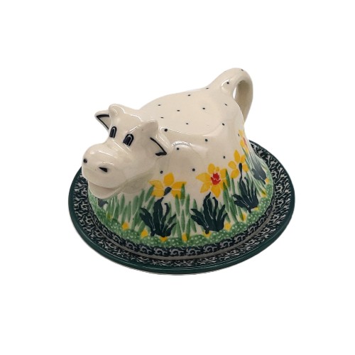 Urocza maselnica w kształcie krówki to wyjątkowe połączenie funkcjonalności i tradycyjnego bolesławieckiego wzornictwa. Ręcznie formowana i zdobiona charakterystycznym, kwiatowym motywem w odcieniach żółci i zieleni, stanowi nie tylko praktyczny element wyposażenia kuchni, ale również piękną dekorację stołu.