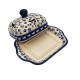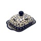 Maselnica z ceramiki bolesławieckiej o wymiarach 15 x 21 cm to stylowy i funkcjonalny element zastawy stołowej, wykonany z wyjątkową dbałością o detale. Pokrywka i podstawka maselnicy ozdobione są ręcznie malowanymi motywami z kocimi łapkami oraz kotkami  w odcieniach kobaltu i czerni. Szkliwiona powierzchnia zapewnia maselnicy trwałość i odporność na działanie tłuszczu, dzięki czemu masło długo zachowuje świeżość. Ten elegancki element zastawy pięknie prezentuje się na stole, doskonale pasując do innych naczyń w stylu bolesławieckim, a jednocześnie wnosi do wnętrza akcent tradycyjnego, polskiego rzemiosła.