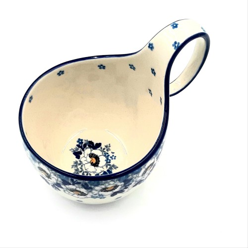- Dekoracja: Czerpak zdobi piękny, ręcznie malowany wzór przedstawiający motyw kwiatowy w odcieniach niebieskiego.